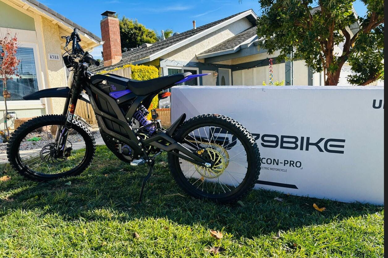 The Falcon Pro is a high-performance electric dirt bike featuring a range of up to 75 miles and a top speed of 53 mph. It is equipped with a Fastace 2.0 Fork for a smooth ride.