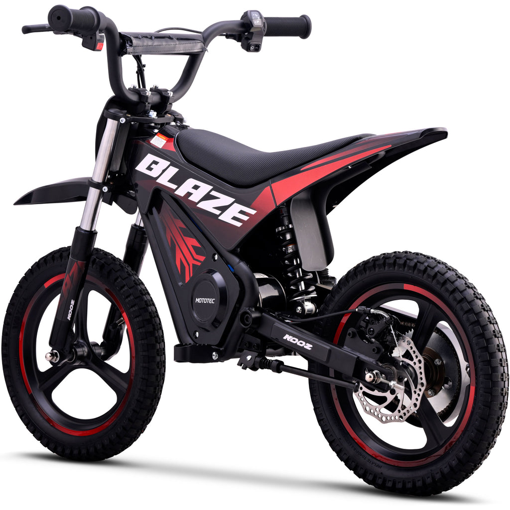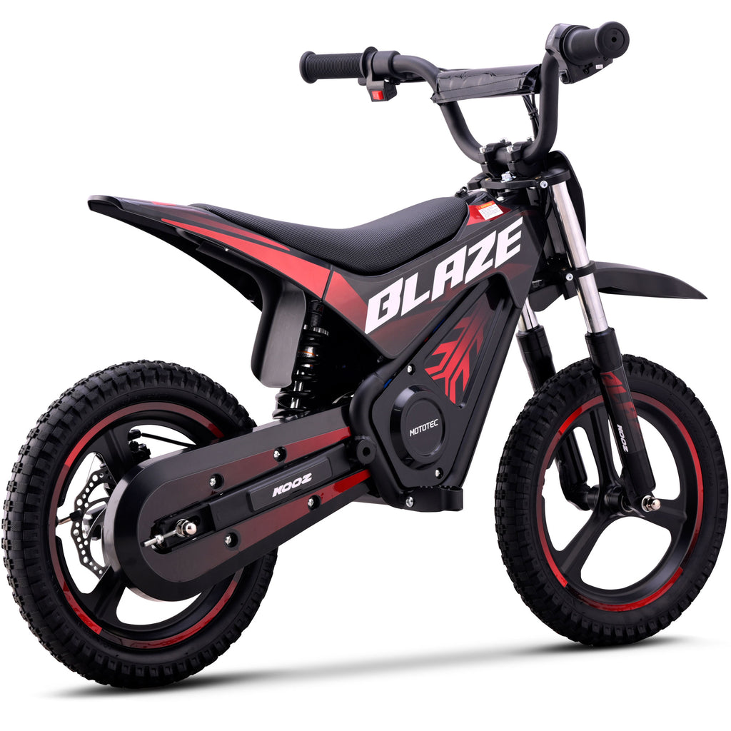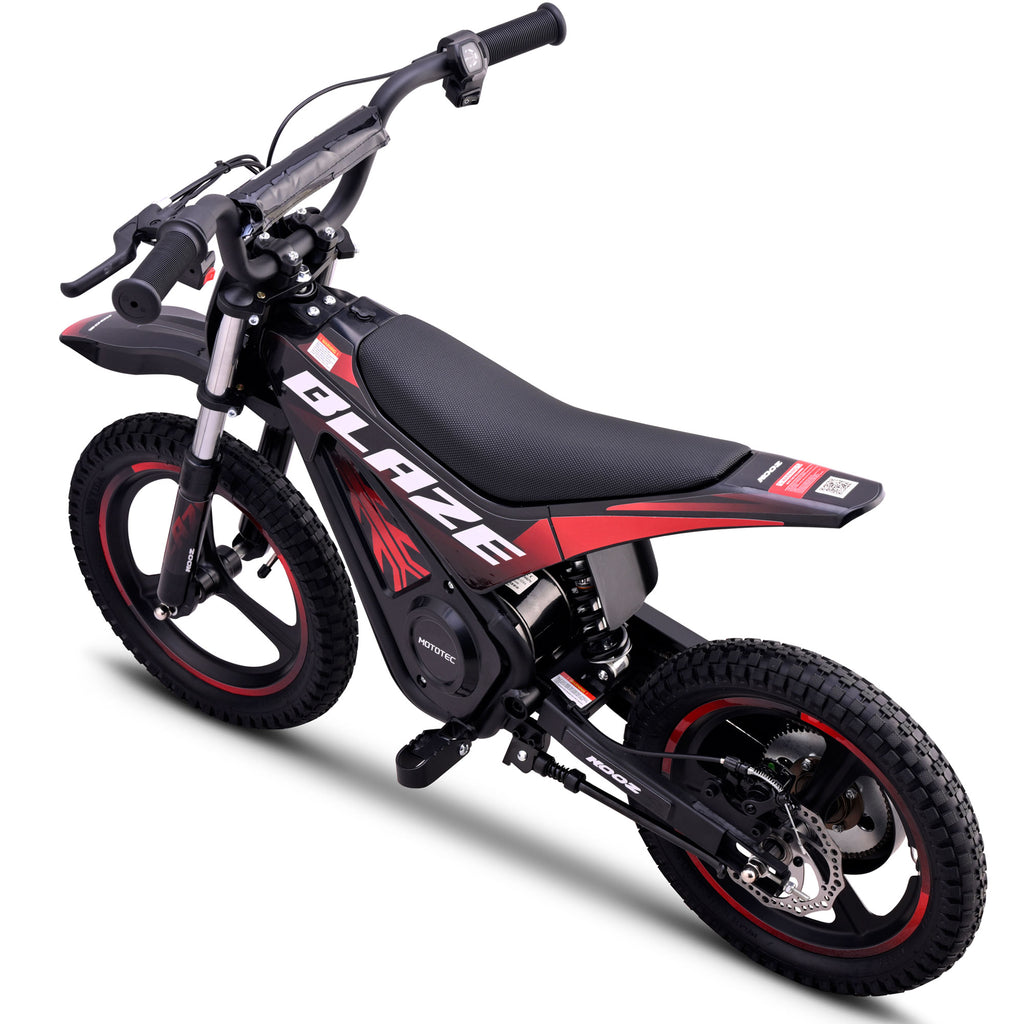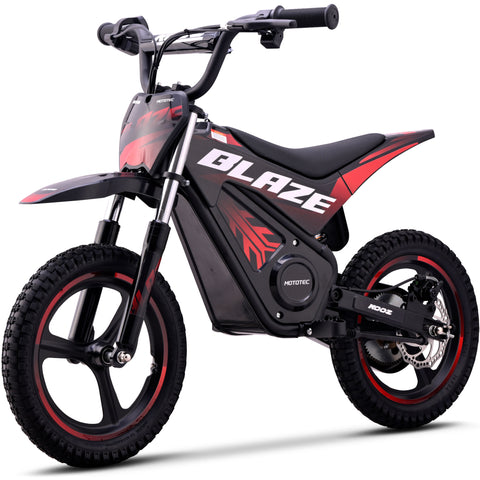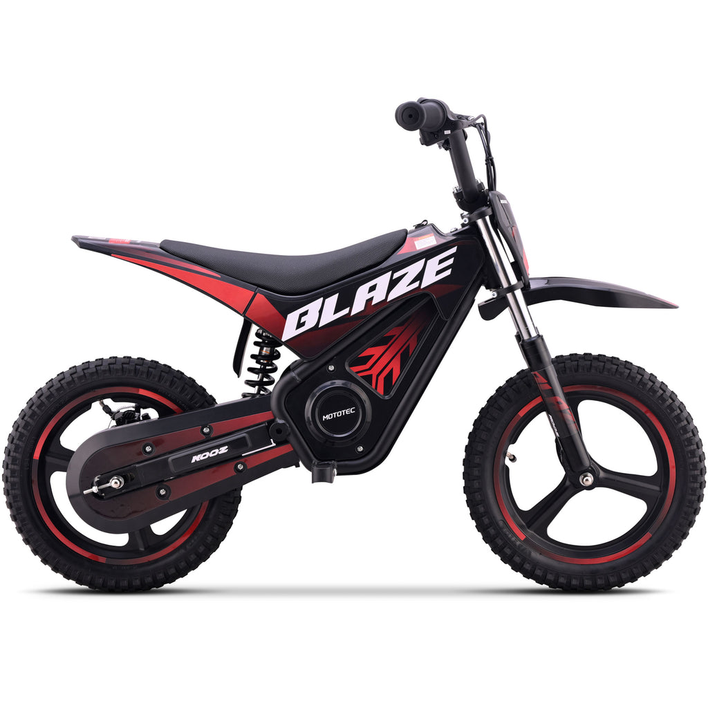 Introducing the MotoTec Blaze 36V 350W electric dirt bike! Powered by a 350 watt electric motor, rugged chain drive, front & rear suspension and variable full twist throttle. Great for driveway and backyard fun, cruise over bumps and speed through dirt trails with ease.