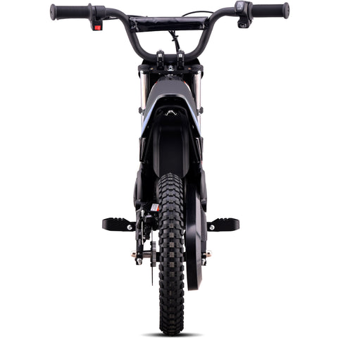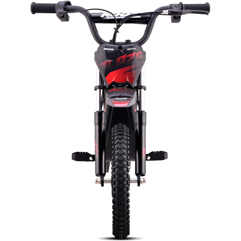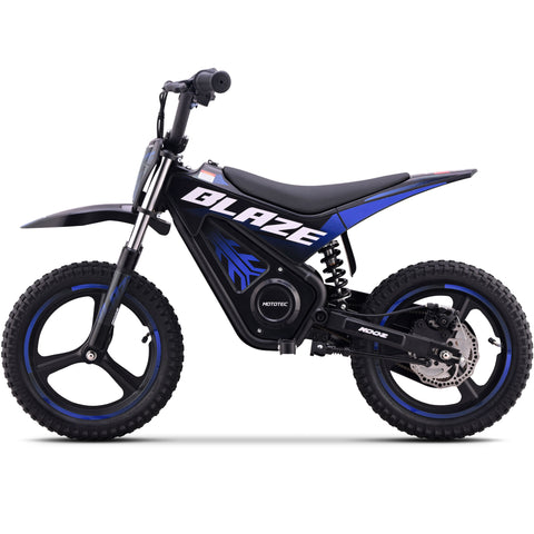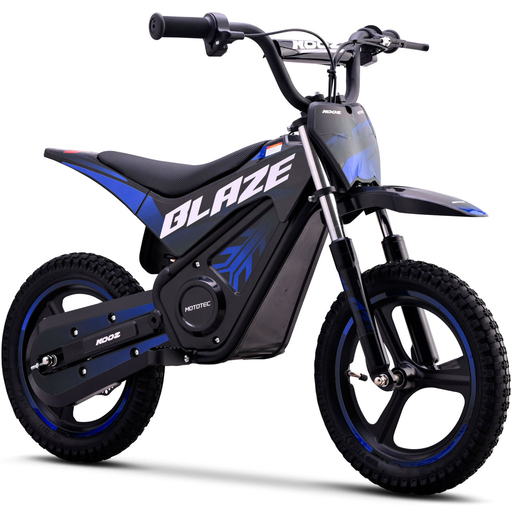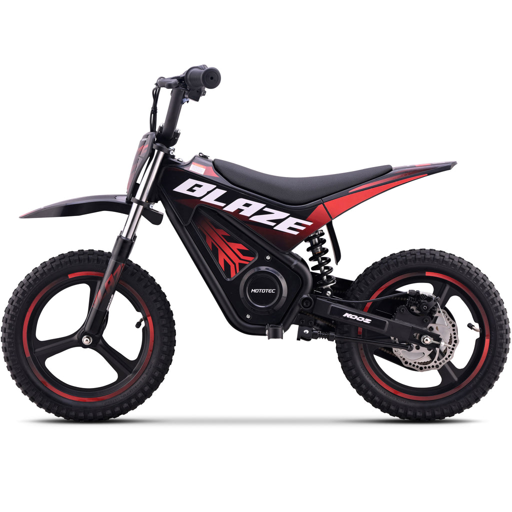 Introducing the MotoTec Blaze 36V 350W electric dirt bike! Powered by a 350 watt electric motor, rugged chain drive, front & rear suspension and variable full twist throttle. Great for driveway and backyard fun, cruise over bumps and speed through dirt trails with ease.