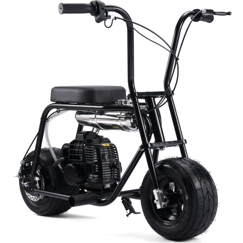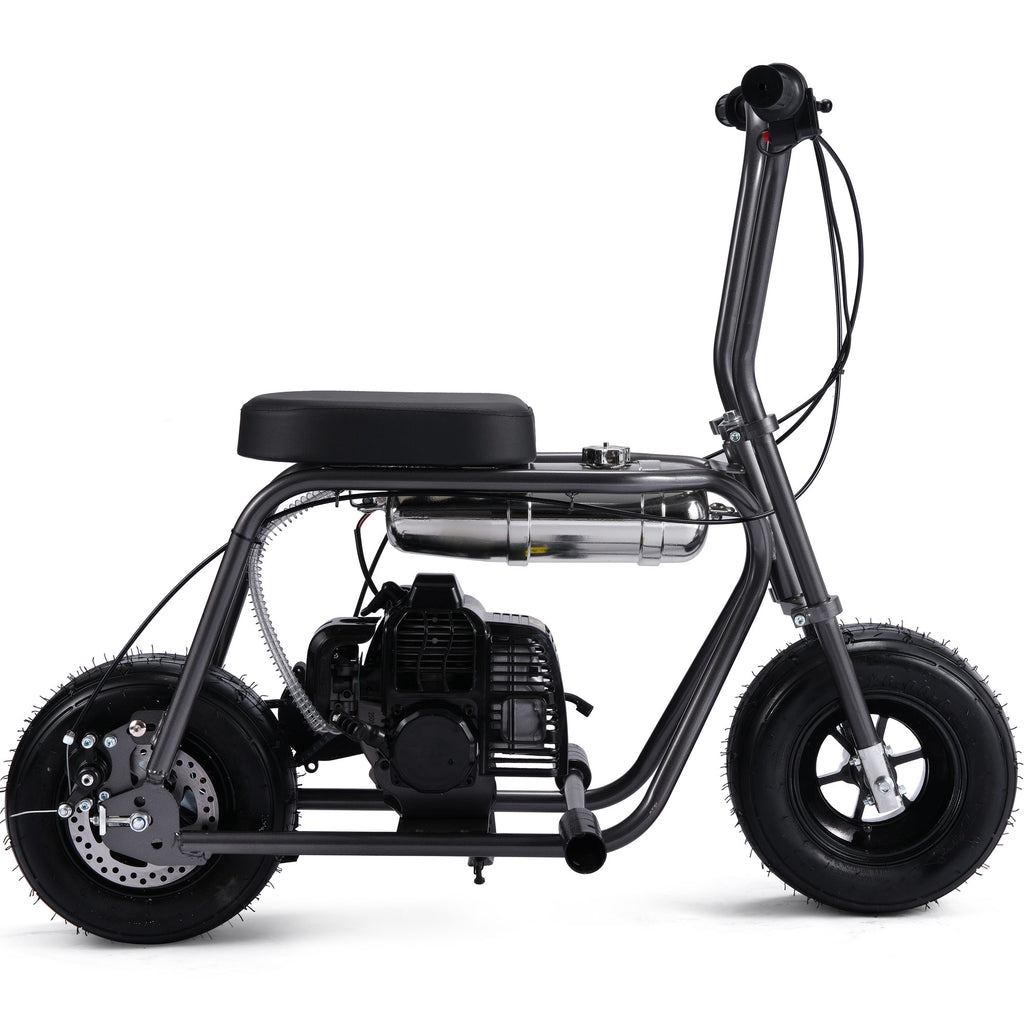 The MotoTec 49cc Wild Rover Gas Mini Bike. Just like the ones your parents used to drive, only safer and easier to use. Powered by a 49cc 2-Stroke engine and automatic clutch to ensure easy operation. Just twist the throttle and go, perfect for beginner riders. This little monster packs a punch, perfect for cruising in the yard or dirt trails with its large wide air-filled knobby tires.